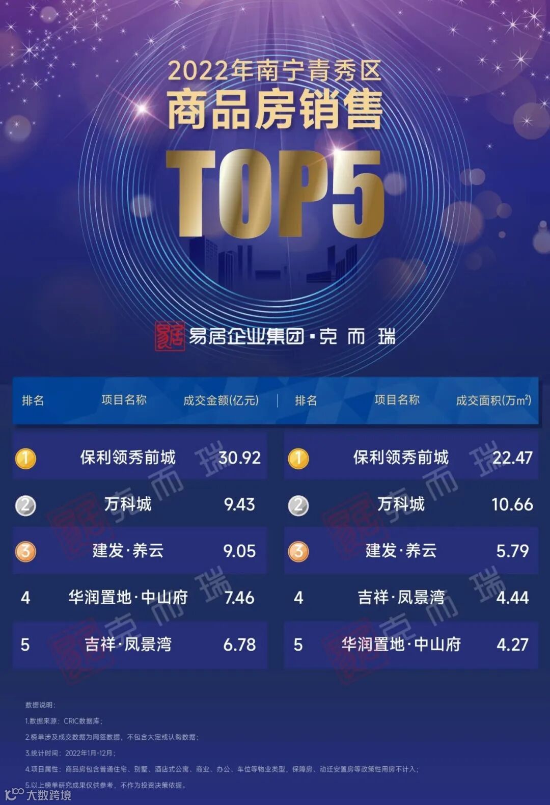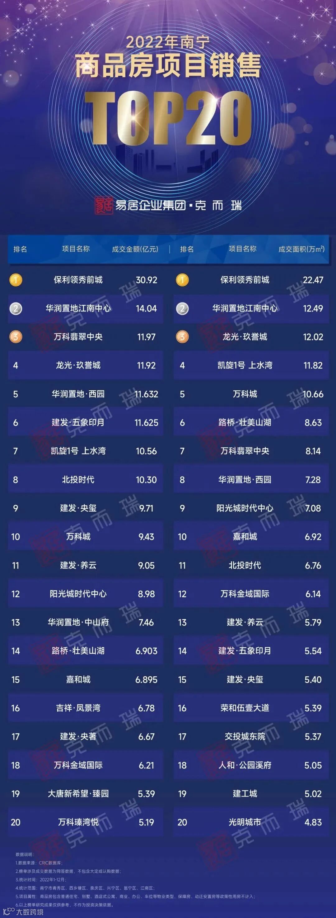 而单独聚焦单盘,更可以看到,相比往年大多数是以刚需盘为主打,2022年上榜单盘榜前20的项目有不少是主打改善客群的项目。建发·五象印月、万科翡翠中央、华润置地·西园、北投时代(二期北投时代·峯范主打改善大平层)、建发·央玺、建发·养云、万科城、华润置地·中山府、建发·央著、万科瑧湾悦这些项目,都是在改善市场表现相当突出的。