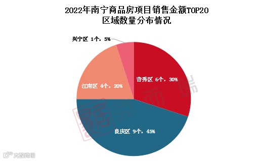 2022年度单盘销售金额TOP20的楼盘分布情况:五象9盘,青秀6盘,江南4盘,兴宁1盘。一改往年五象“碾压性”优势,如今青秀和江南也有更多楼盘上榜。