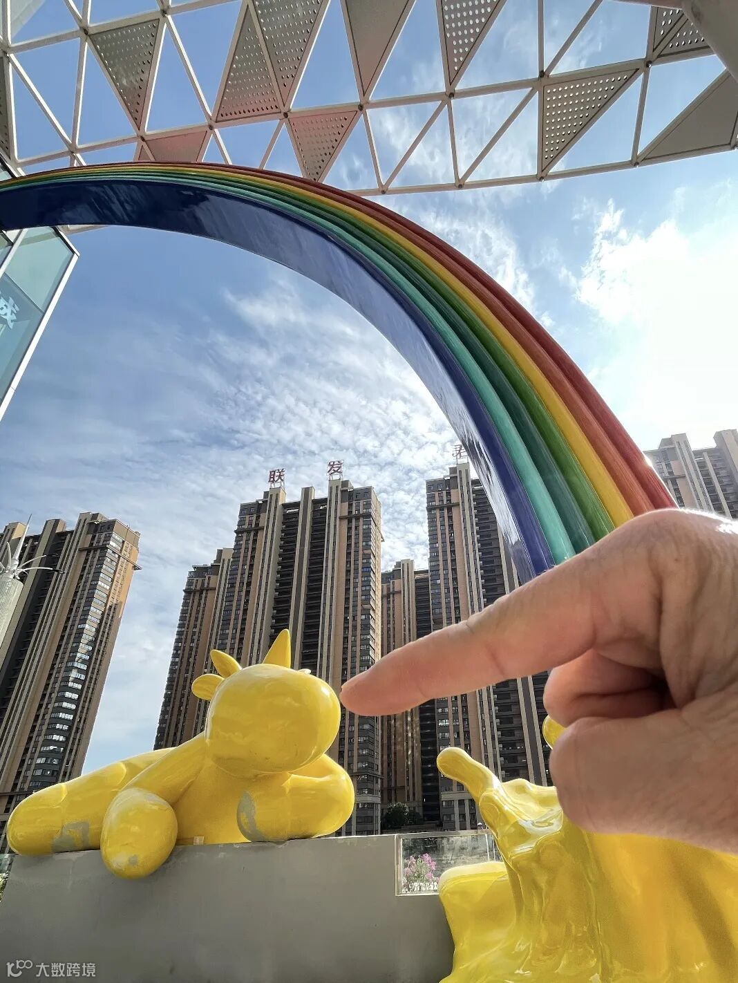 4)自创了商业的独角兽IP,名字叫PUPU。就是这个黄色的独角兽,其中一只悬挂在空中,躲在彩虹下,萌萌哒样子。前面还搭配了一个网红露天退台。