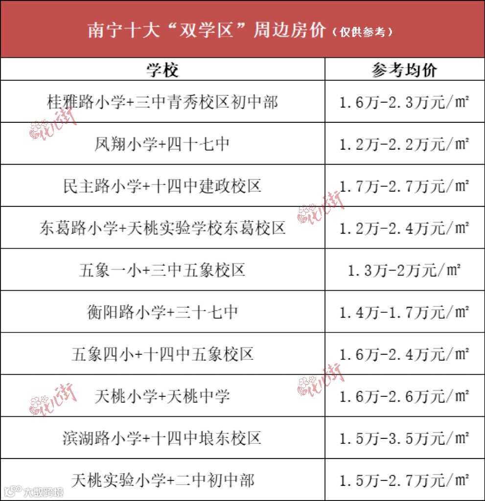 最典型的莫过于华润二十四城,南宁三中初中部五象校区+五象实验一小的超高配教育资源,叠加华润置地品牌影响力和产品力,这个项目成为了南宁十年来升值最快的楼盘之一,一度从2014年首开的单价“4999起”坐火箭般升到了2.3万+/平米的高点。