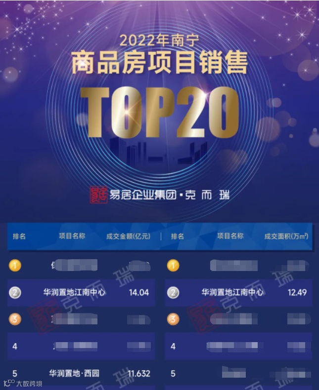 在克而瑞公布的2022年南宁商品房项目销售20强当中,华润置地旗下两个项目,江南中心以及西园项目,双双上榜TOP5,引领了江南的逆袭。