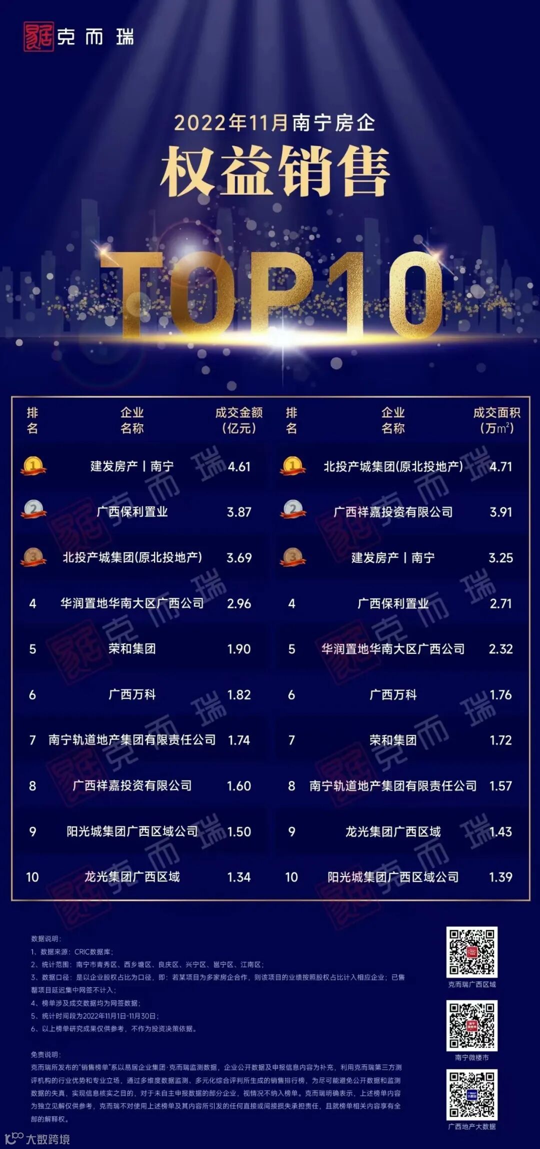 正因为五子取得如此好的业绩,北投产城在2022年11月的南宁市房企权益销售榜中,实现4.71万平方米的销售面积,位居全榜单榜首。