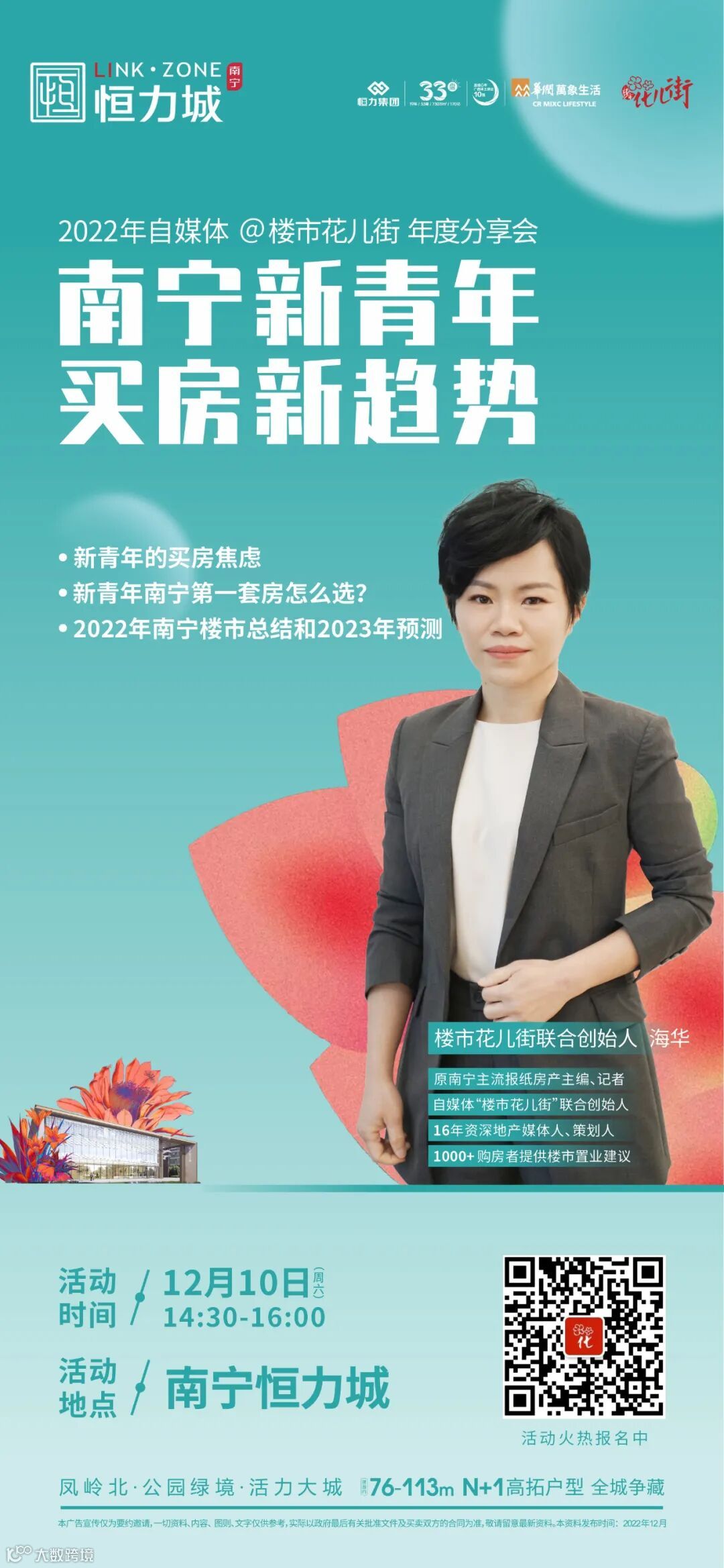 最后插播一条信息,本周六(12月10日)楼市花儿街将在恒力城举行年度分享活动,将会为购房者奉上:新青年买房新趋势的主题干货分享以及2022年南宁楼市总结和2023年展望,欢迎花友们报名参与哦~