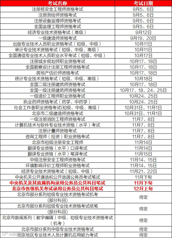 北京市人力资源和社会保障局发布2020年下半年全市人事考试工作计划,明确中央机关及其直属机构录用公务员(2021国考)、北京市各级机关考试录用公务员(2021京考)公共科目笔试时间,小编为了大家能看的更清晰已经在下表中标红,一起来看看吧。