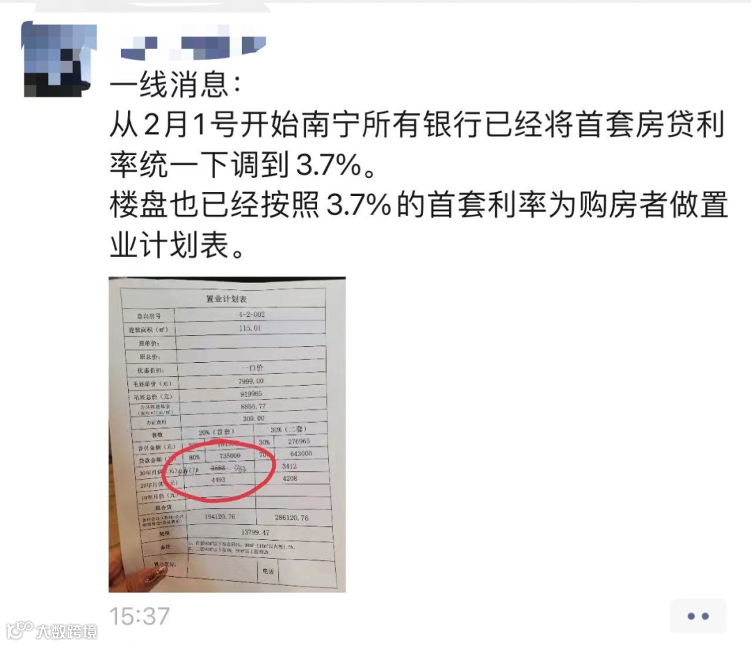 “即日起,南宁市阶段性调整首套住房商业性个人住房贷款利率下限。按照现行LPR,我市首套住房商贷利率下限将下调为3.7%”