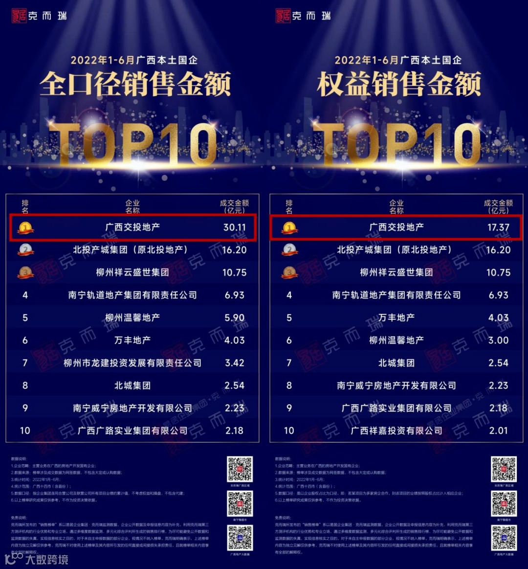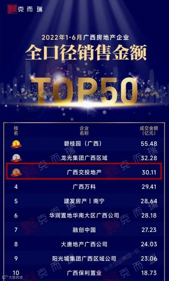在楼市表现上,今年7月17日克而瑞研究中心发布的广西区域2022上半年广西房地产企业销售金额排行榜中,广西交投地产上半年以全口径金额30.11亿元、权益金额17.37亿元的成交金额蝉联广西本土国企TOP1。
