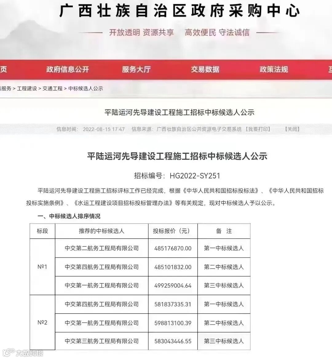 △四航局:中标平陆运河先导建设工程第二标段青年枢纽一期工程。