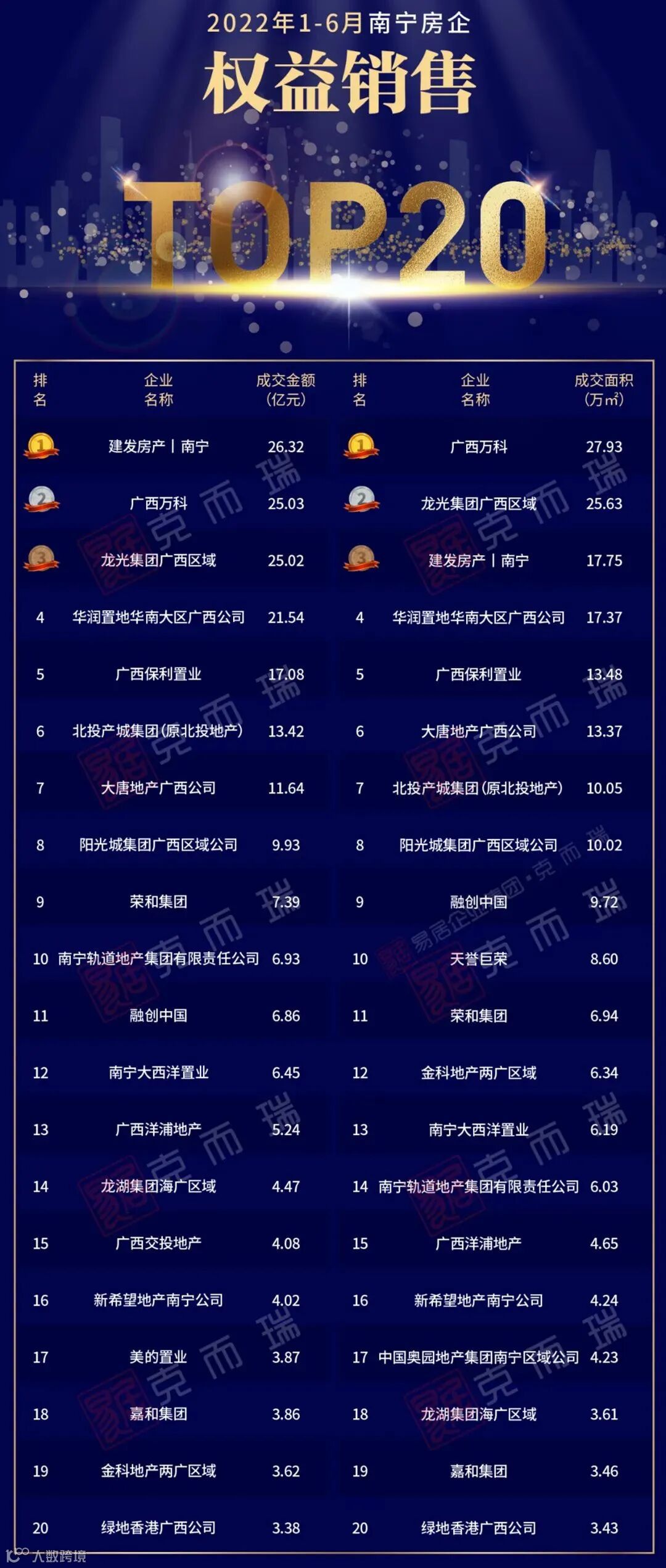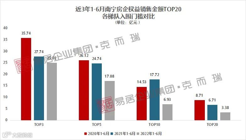 克而瑞的数据显示,今年上半年南宁房企权益销售金额TOP20各梯队入围全部门槛下滑,说明大家的日子普遍不好过。