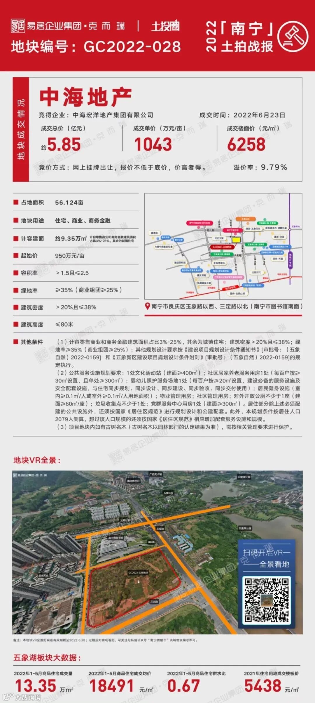 昨天上午,中海地产5.85亿拍下五象湖56亩住宅、商业综合地块。楼面价仅仅6258元/㎡。