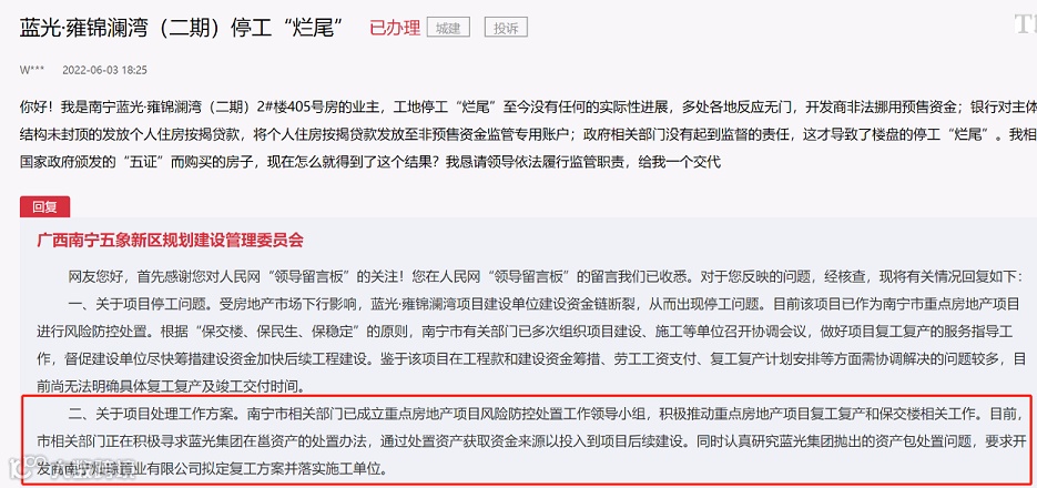 另外,从领导留言板的最新回复来看,蓝光在邕的资产处置,或可能是项目后续建设的资金来源。