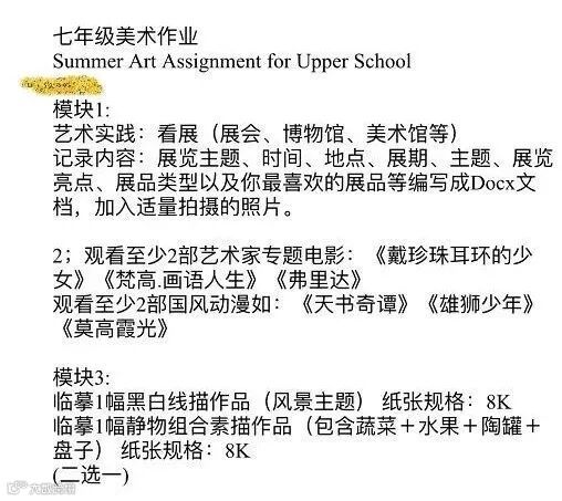 我必须得承认,《戴珍珠耳环的少女》的维米尔和《佛里达》的一字眉,我都是到了大学的偶然机会,才开始了解到这顶级大师的作品。而这所学校在初中阶段的暑假作业,就能开始让学生打开艺术视野了?