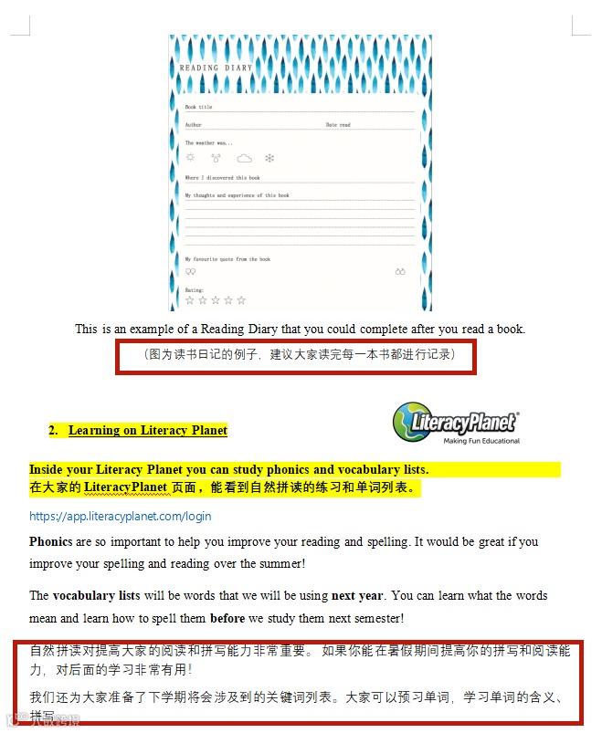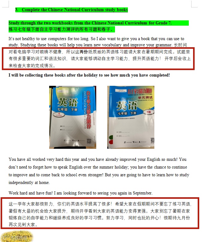 “亲爱的同学们,你们的暑假作业分为三个部分”、“这一学年大家都很努力,你们的英语水平提高了很多”……