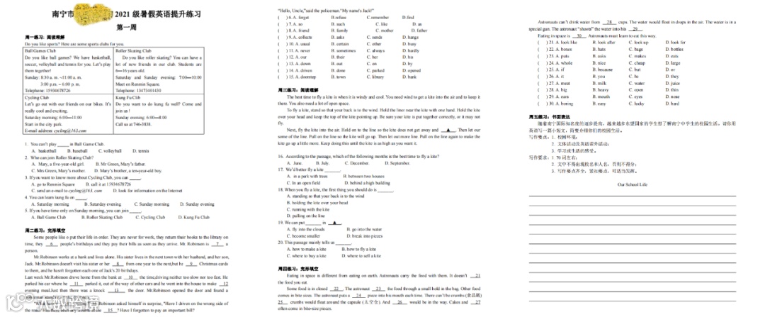 我还拿到了同一学校的一份初一年级的英语作业:看看这阅读理解、完形填空、书面表达三大类,当年的英语“听不懂暴击”迎面而来。