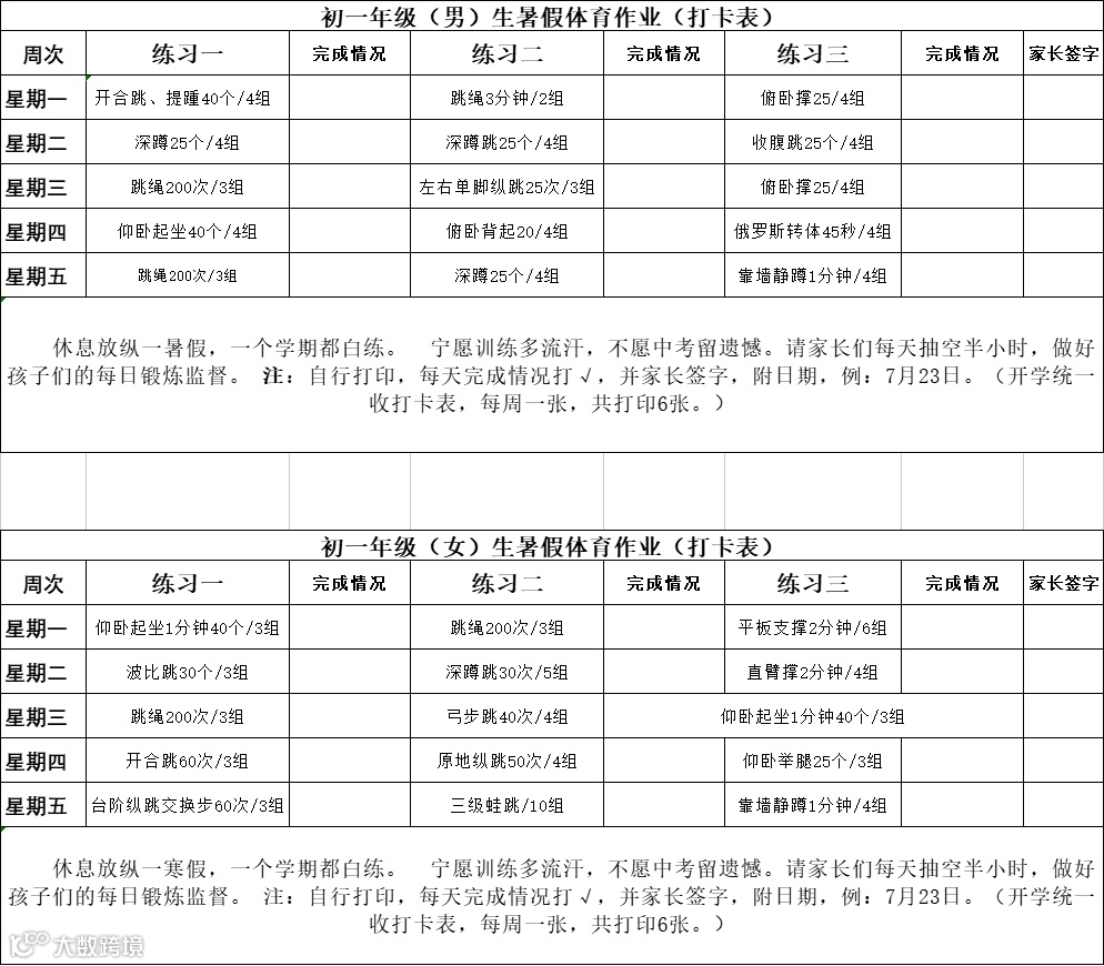 这份暑假作业很详细,甚至做了一份打卡表,每天做什么样的练习及数量清楚明了,并要求家长签字监督。“家长签名”四个字很震撼。
