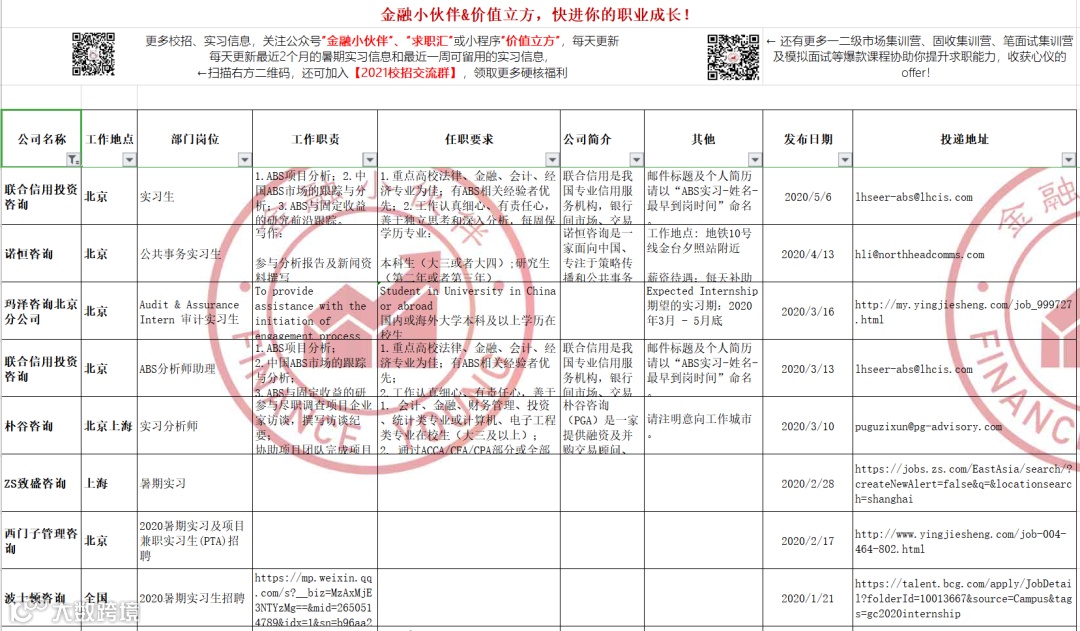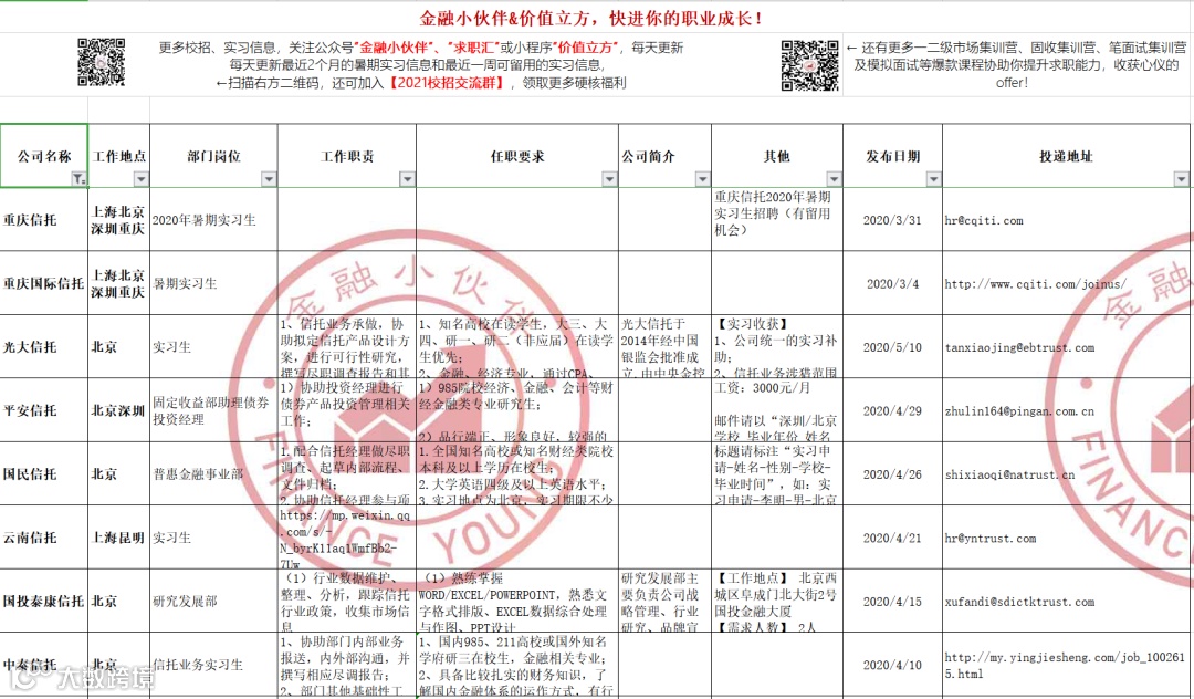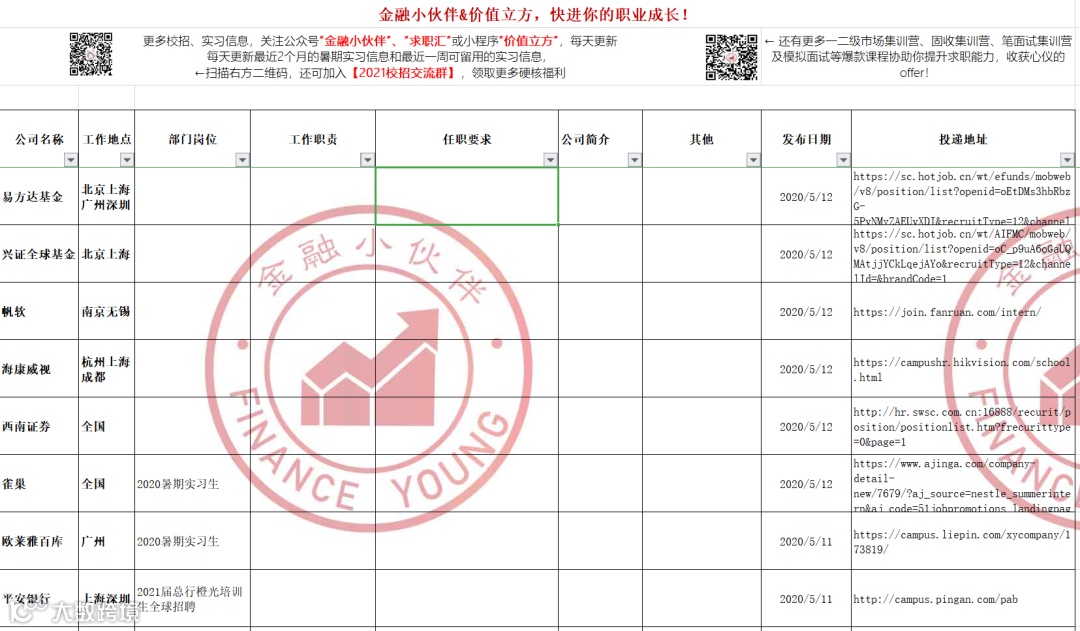 金融小伙伴致力于搭建一个金融垂直领域职业信息分享和交流公益平台,通过持续不断的公众号推文和线上线下活动,提供及时、全面、高效的行业招聘信息和职场提升经验。目前,我们已吸引了超过100万粉丝,在海内外金融学子和在职人士中均享有盛誉。