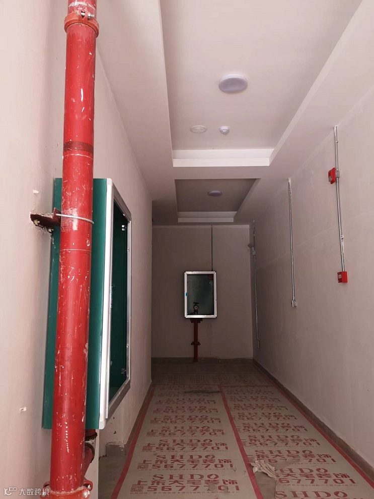 我被这个过道给惊呆了。两个消火栓全部毫无遮掩地明装在墙体外面,不但严重影响美感,而且,由于箱体和管道凸出,侵占了过道空间,人们走动时,尤其是小孩子,很容易就在头上撞起个包。