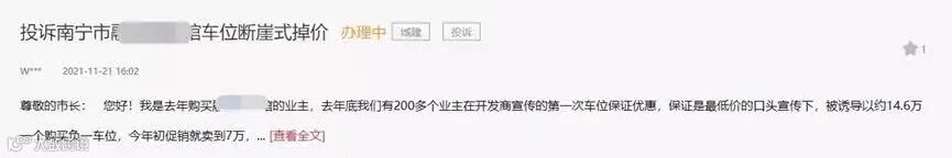 在人民网的留言板上,我们看到去年南宁跳水跳得最狠的一个案例是,某小区的车位从接近15万一路降到了4万。价格降得有多狠,前期高位买入的业主心就有多痛。
