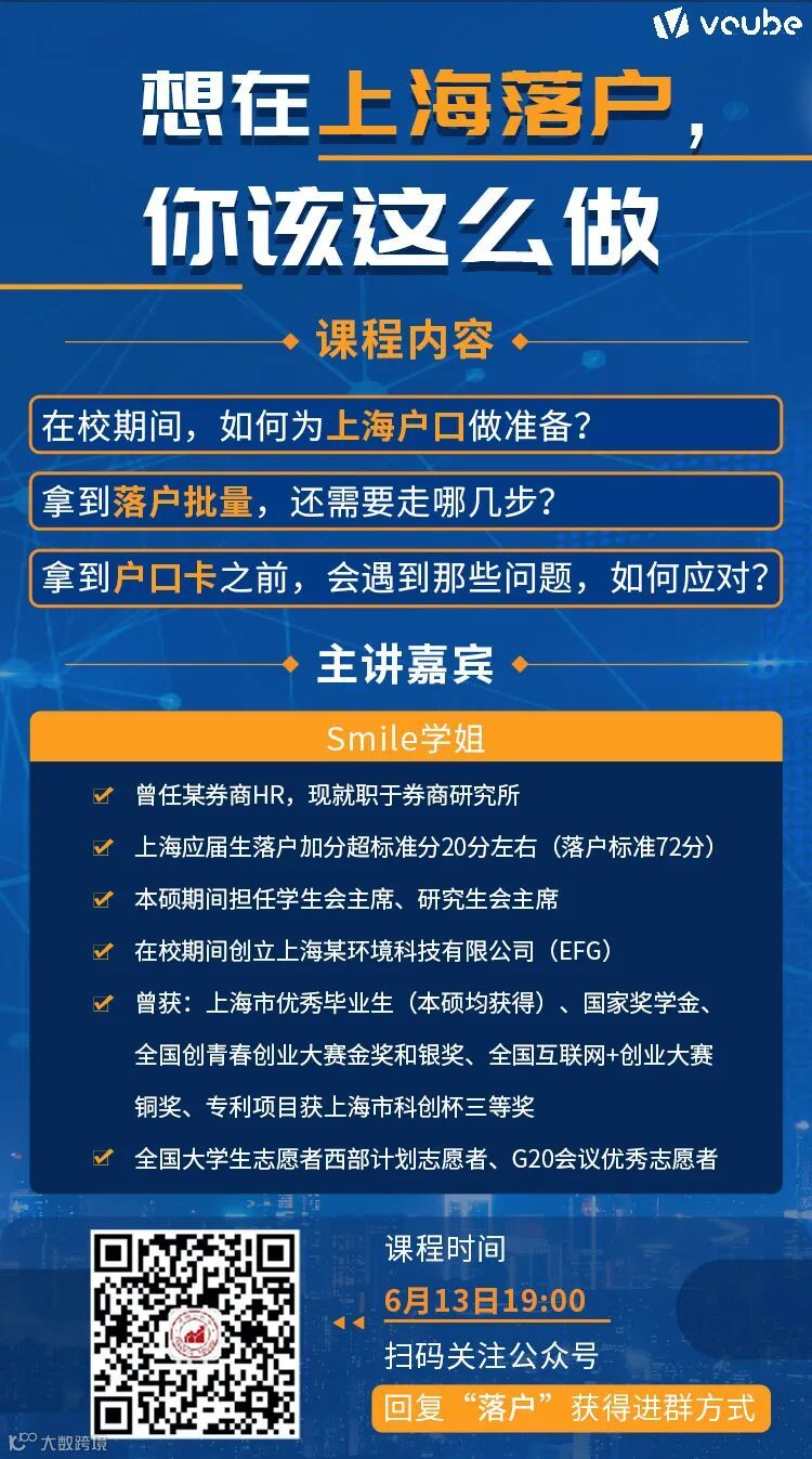 所以,本周六6月13日晚19:00,我们邀请了Smile学姐为大家解答“我是如何落户上海的?”,摇身一变成为“上海银”!