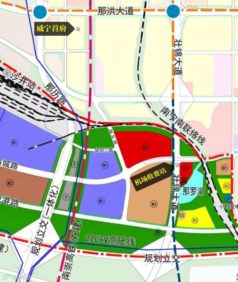 特别是壮锦大道与高岭路交叉处形成的商业商务中心,与目前已经建成的绿港商务中心隔路相望。周末花儿姐从威宁首府的售楼部出发,沿着留村路穿过大片的民房,将近1.2公里的距离,可以远眺未来规划的“南宁国际铁路港”商业商务中心。