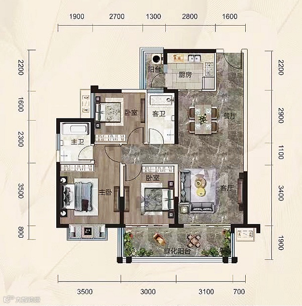 高层产品为108-126㎡三至四房,各个空间的尺度都比较舒适。