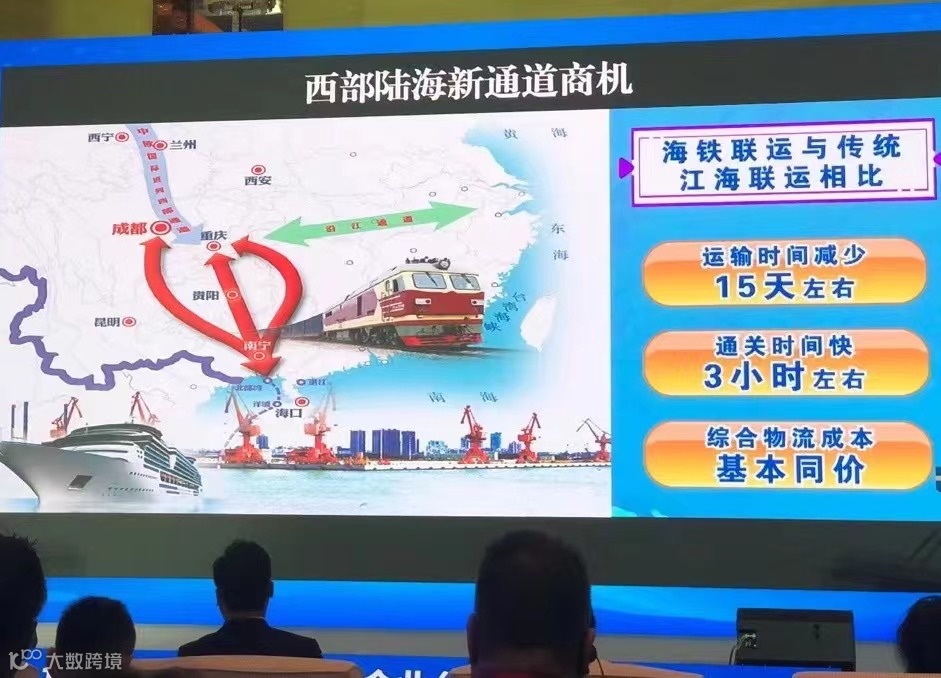 近期,广西正在上海举办“2021广西对接行业领军企业(上海)项目洽谈会”,图片是洽谈会正在介绍的南宁和西部陆海新通道的优势。