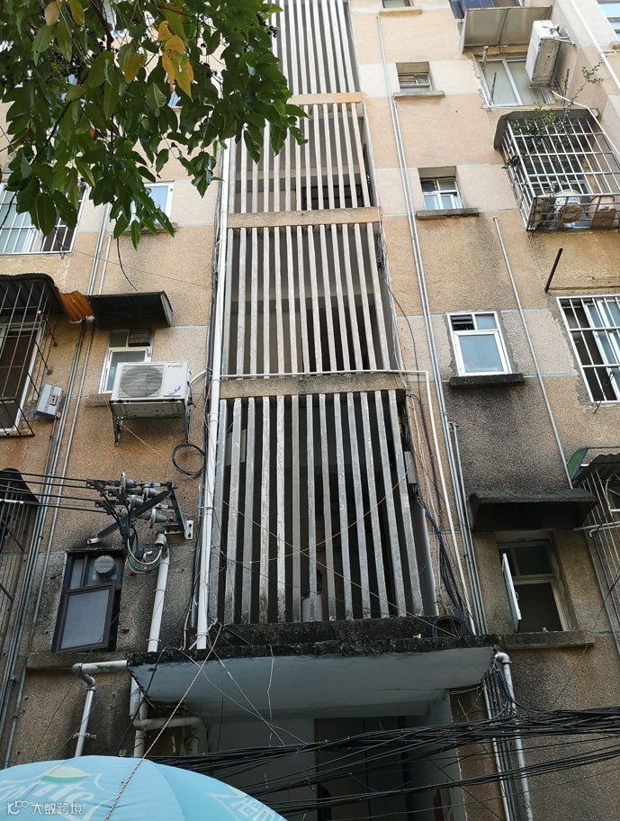 也许是因为当年的工艺水平跟不上,有些楼栋楼梯间的镂空栅栏,高矮一致但“胖瘦”不一,有些明显粗一点,有的又娇小不少。而且,每一根的“站姿”都不尽相同,有的笔直,有的略倾斜,远看过去,像是有人从楼顶挂了一筷子面条下来↓↓