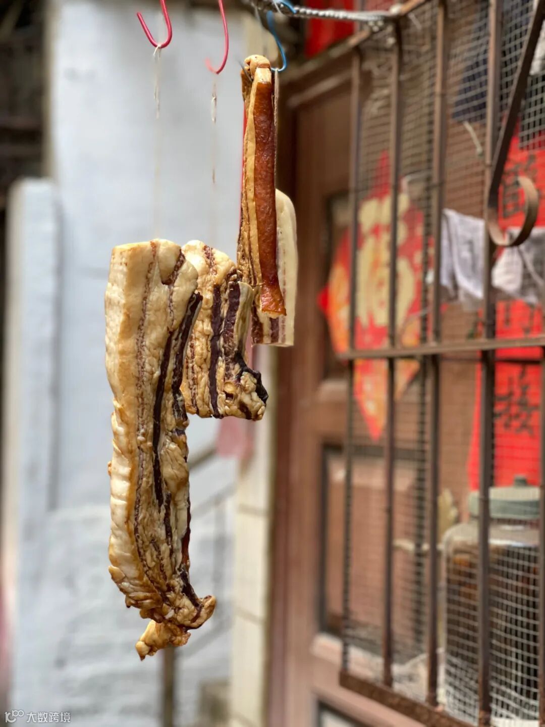 路过一家云吞店,店家门口正晾着一块块腊肉,都是上好的五花肉↓↓