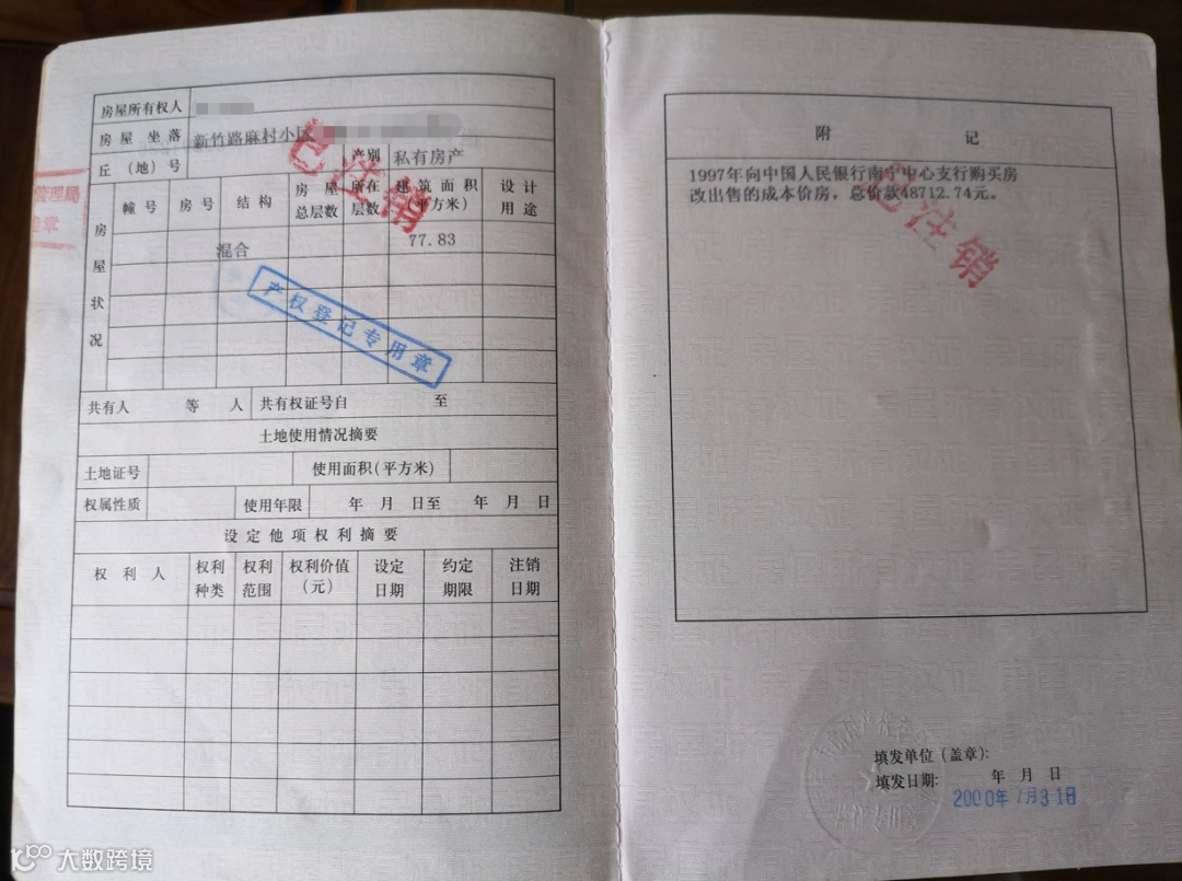 朋友买的那套房,从其前任业主的产权证上的信息来看,拿证时间是1997年,至今已24年。售房单位为中国人民银行南宁中心支行,总价约4.9万。