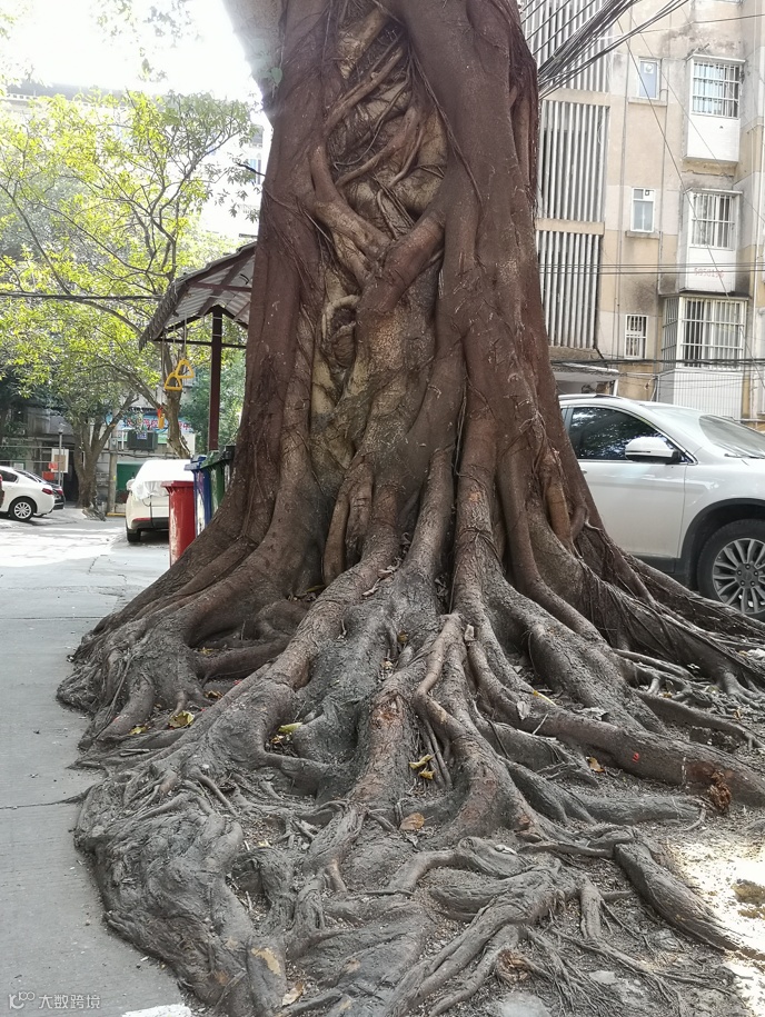 小区里大树很多,每条路都有,亭亭如盖。有一棵古榕,看起来年事甚高,树干巨大,估计三个成年人手拉手都合围不了。裸露在外面的锈褐色的气根,盘根错节,像怪物的爪牙一样。