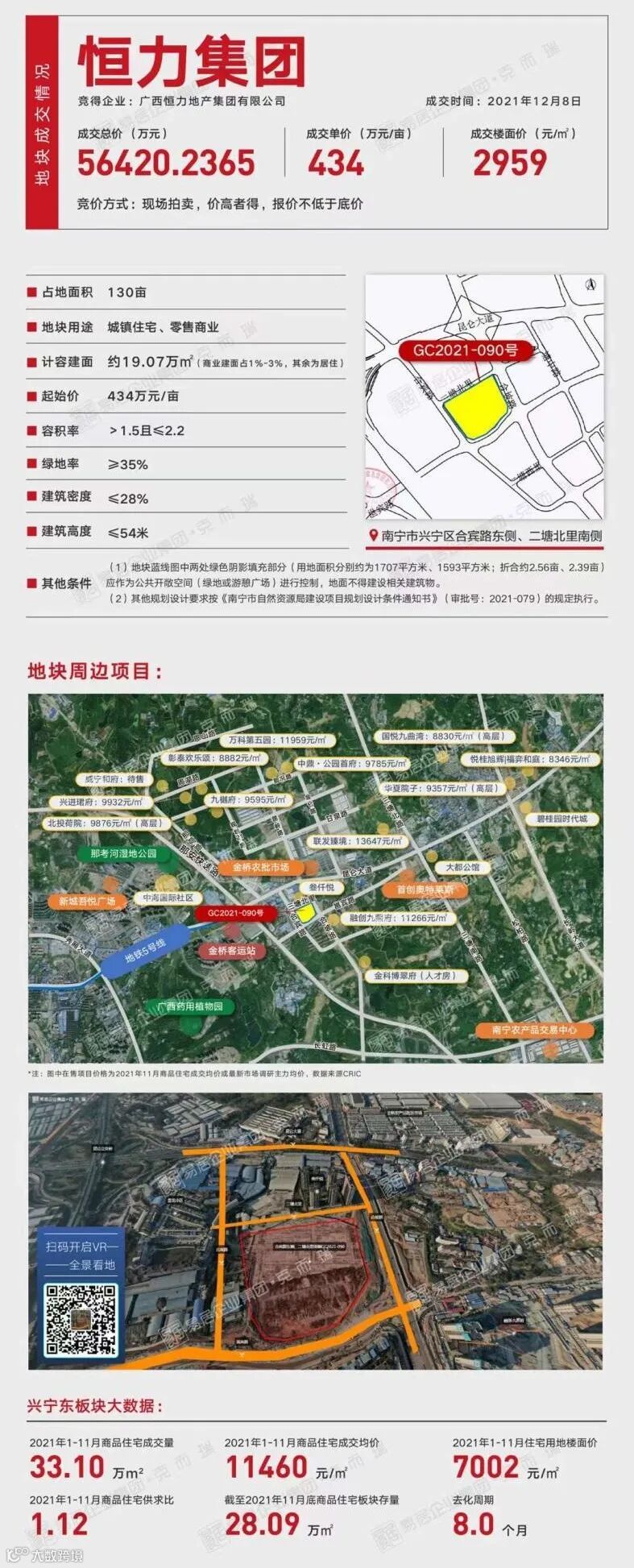 地块最终由广西恒力地产集团有限公司(恒力集团)以约5.642亿元总价拿下,成交单价434万元/亩,成交楼板价2959元/㎡。