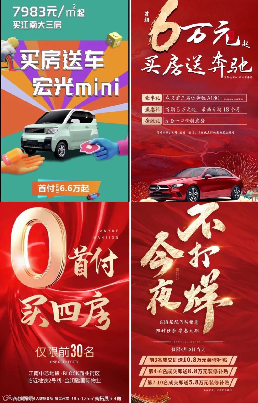 45年物业费还不够劲爆的话,那买房0首付能不能挑起你满屏物欲?如果不行,那“买房送宏光MINI”、“买房送奔驰”呢?