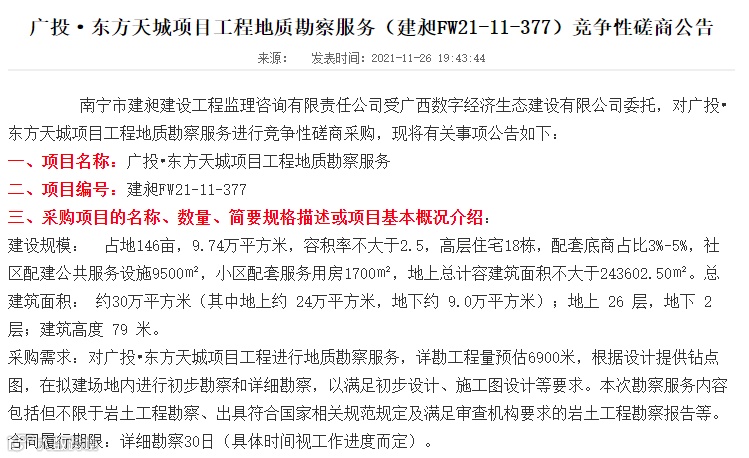 公告显示,广投东方天城,容积率不大于2.5,高层住宅18栋,配套底商占比3%-5%。