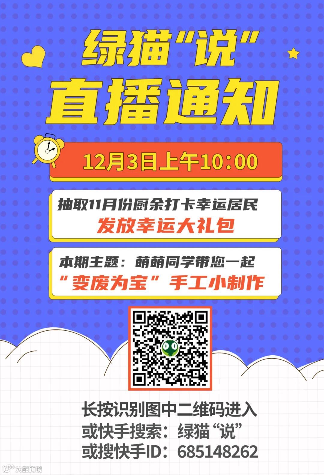 【直播通知】12月3日上午10点,抽取11月份厨余打卡幸运居民,萌萌带您做手工