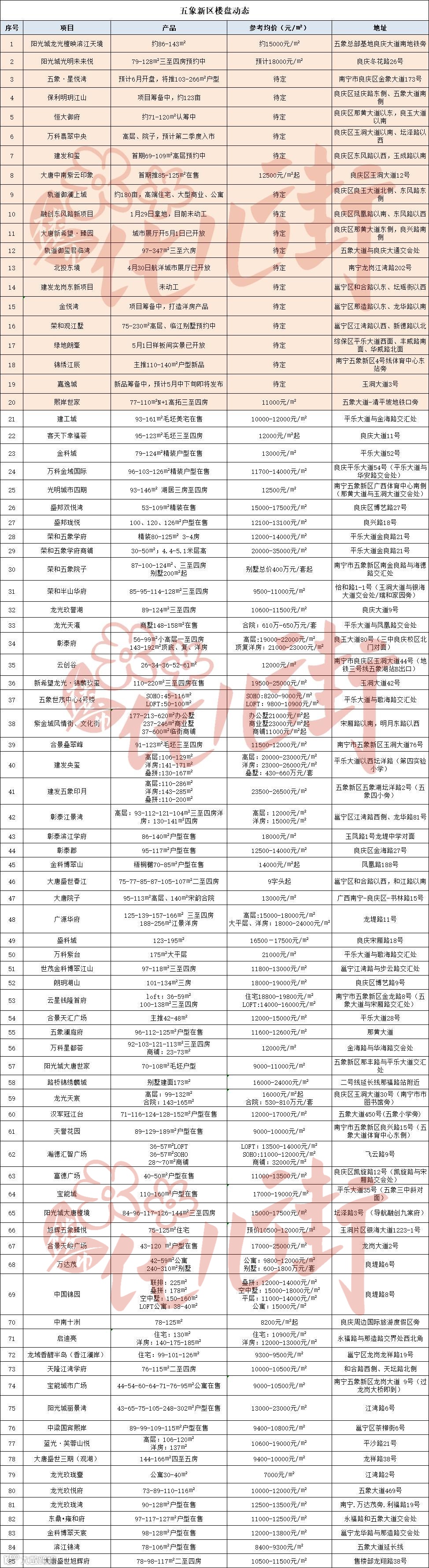 从在售楼盘情况来看,目前五象主力在售楼盘达到85个,其中新盘就达到20个,其余区域除了青秀6个外,基本上都是2-3个。