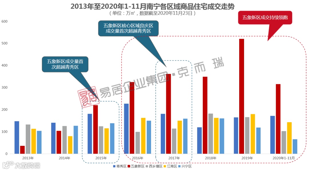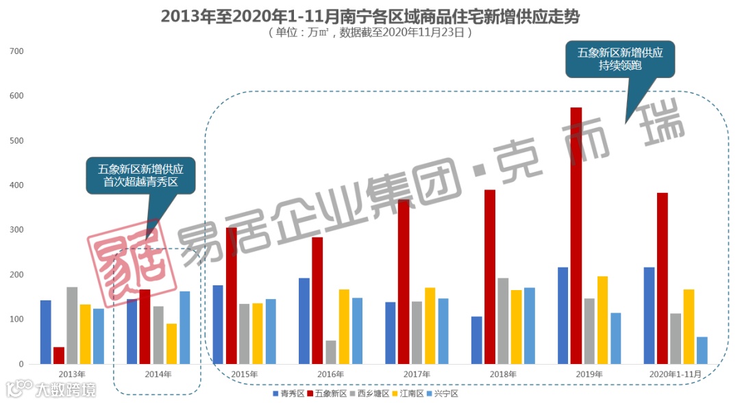 明显的转折发生在2014年,那一年,“万绿宝合华”都开卖了,作为城市“重点向南”的拳头区域——五象新区商品住宅新增供应首次超越青秀区。