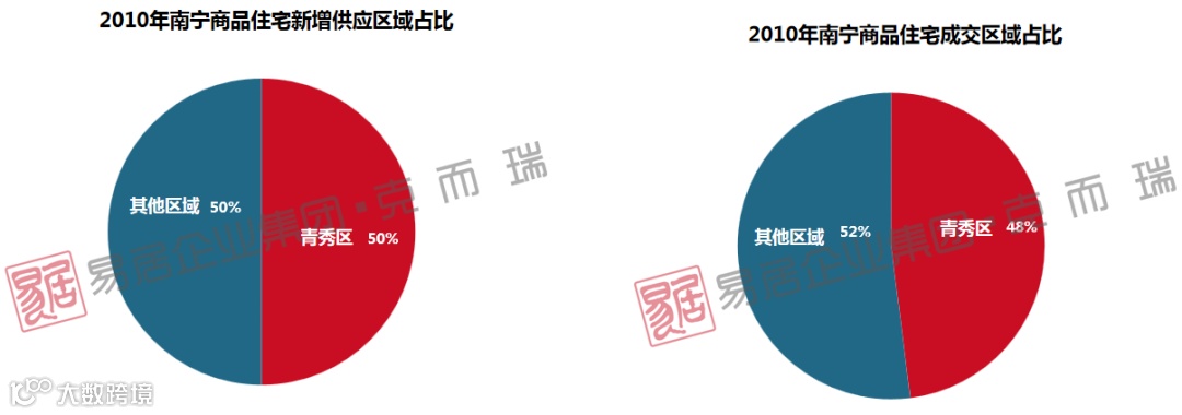 从克而瑞数据来看,10年前,南宁楼市的“老大”明显是青秀,2010年,青秀区商品住宅供求都占据了“半壁江山”,占比均在50%左右。