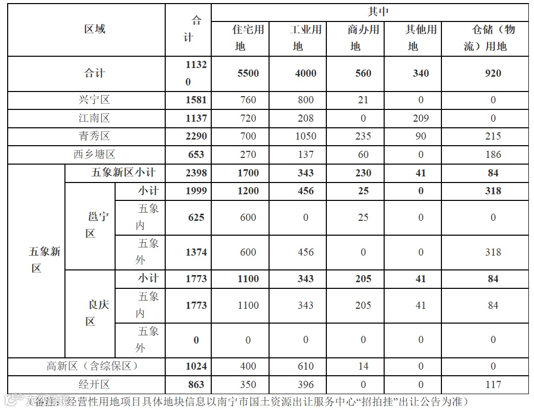 从上表显示的数据来看,五象新区仍是供地大户,经营性用地及普通商品住宅用地供应处于领跑地位。