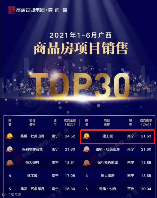 从克而瑞发布的数据来看,一个亮眼的成绩引起众人的关注:位于五象南的千亩大盘建工城以接近22万平方米的成交面积,一举成为广西今年上半年度单盘榜的面积销冠。