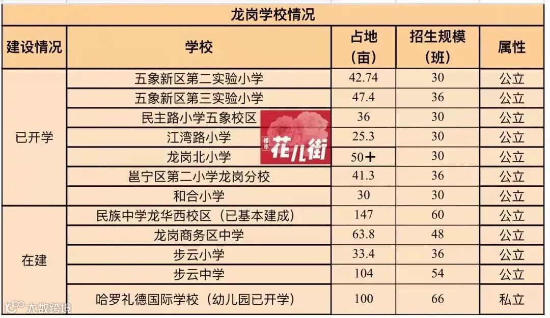 首先,在数量上,龙岗目前已确定的学校共13所,而五象南还在个位数。而且,龙岗已开学过半,其余的学校有5所在建,预计今年内基本都会完工,1所大唐盛世旭辉府旁边的规划中学尚未正式动工。
