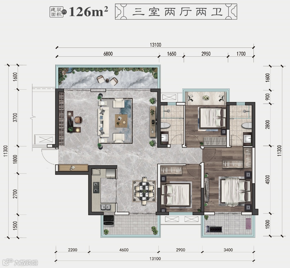 另一个槽哥想重点推荐的是126平米户型,做到南北通透,南北双阳台,可以灵活设计,选择三房或者四房设计。北向阳台长达6.8米,选择大横厅设计让客厅更加大气。南向主卧带景观阳台,带来更好的采光通风,同时进一步拓宽主卧使用空间。
