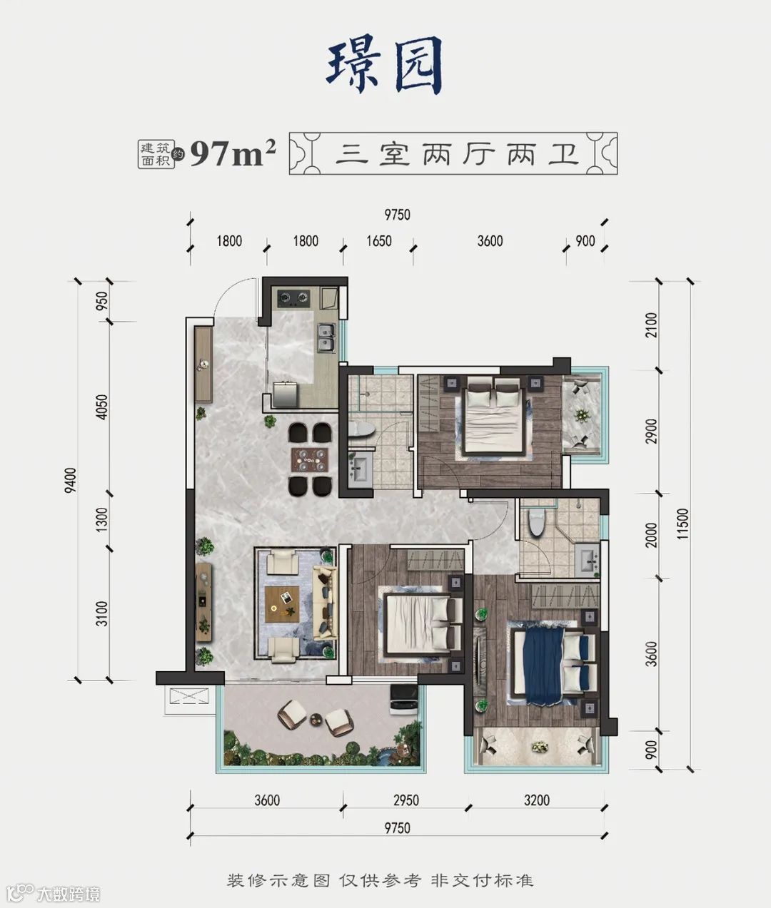 97平米户型做了三房两厅两卫格局,户型方正,全赠送约12平米朝南大阳台,两间卧室带飘窗。主卧、客厅、阳台均为朝南设计,进一步保证了采光和通风。