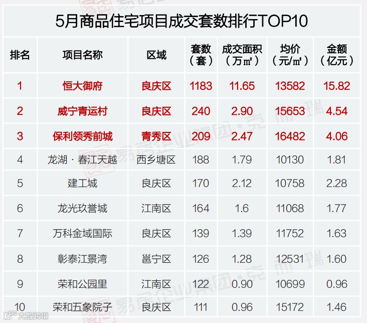 5月的南宁商品住宅项目成交套数排行榜上,出现了一位“不速之客”。在前五名长期被良庆和青秀联合霸榜的“传统”格局下,来自西乡塘的龙湖春江天越以月销188套的成绩,成功抢走了一个前四席位。