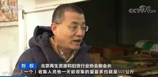 北京再生资源和旧货行业协会副会长刘权:一个收集人员最多一天收集的量是500公斤,如果说我们单纯的去收集这些塑料袋,它更轻是吧,现在一天可能100公斤都收不到,还有运输,它一车基本上是运一吨左右,一吨的成本也在300块钱以上。