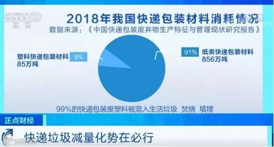 按质量计,2018年我国共消耗纸类、塑料快递包装材料分别为856万吨、85万吨,分别占比91%、9%。其中,99%的快递包装废塑料被混入生活垃圾,焚烧或填埋。记者来到北京市朝阳循环经济产业园,负责人表示,快递包装的原材料大多源于木材、石油等,生产1吨纸需砍伐17棵十年生大树,生产1吨塑料袋需消耗3吨以上石油,回收率低也就意味着浪费生产资源。与此同时,快递包装所使用的防水塑胶袋、胶带、泡沫板、填充气泡袋等主要成分是聚氯乙烯,焚烧后会产生二恶英和酸性气体。