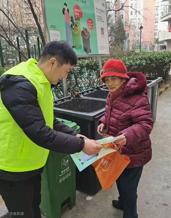 宣传中向居民发放垃圾分类宣传页,讲解生活垃圾的分类类别、投放方式,引导居民从环境卫生、文明生活的角度,通过宣传有效地增强居民的垃圾分类意识,真正做到垃圾分类齐动手、保护环境共行动。