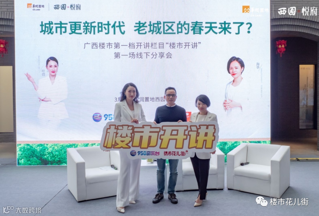 同时,楼市花儿街携手广西广播电视台FM950重磅打造的“楼市开讲”栏目,也举行了线下首秀,《楼市花儿街》合伙人黄海华、广西广播电视台FM950《好房会说话》主持人叶倩、以及华润置地广西公司营销部分管领导陈兴一起“开讲”:城市更新时代,老城区的春天来了?