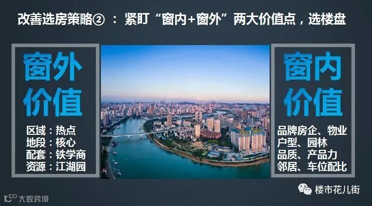 究竟啥是窗外价值?我们的观点是,所谓的窗外价值其实就是楼盘的地段、配套、景观等等外部价值。在热点区域或者是核心地段,配套上有“学铁商”即学区、地铁、商业,资源上有“湖园”江河、湖泊、公园的楼盘,你就有了城市资源的“窗外价值”。