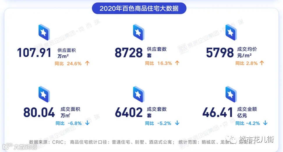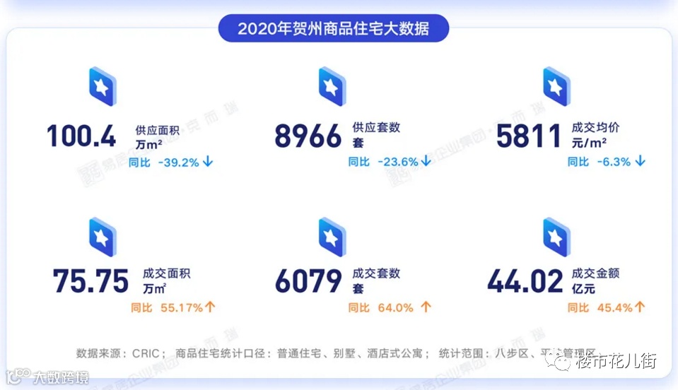 百色、贺州这两个小体量的城市,一个涨一个跌。2020年百色市主城区(不含县份)商品住宅成交面积80.04万㎡,同比下降6.8%;成交均价5798元/㎡,同比上涨2.8%。全年商品住宅成交金额46.41亿元,同比下降4.2%。