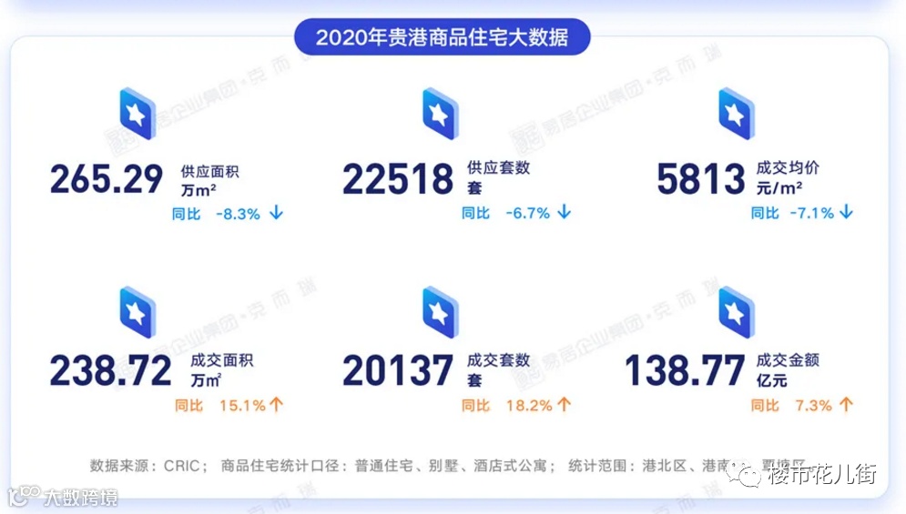 2020年贵港市主城区(不含县份)商品住宅成交面积238.72万㎡,同比上涨15.1%;供求比1.11。成交均价5813元/㎡,同比下降7.1%。
