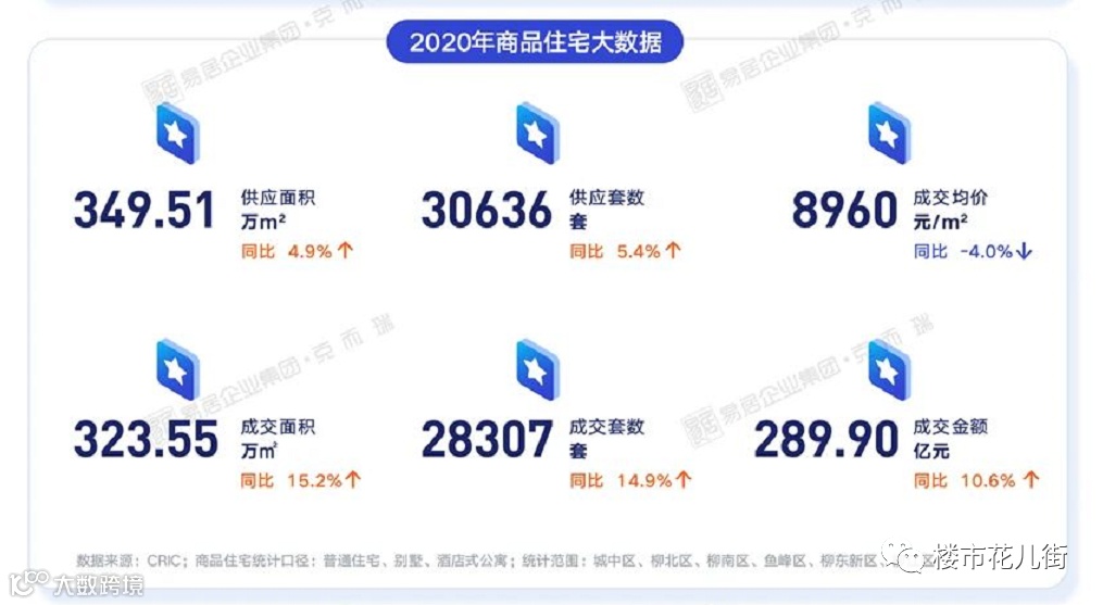 2020年的柳州市主城区(不含县份)商品住宅成交面积323.55万㎡,同比上涨15.2%,成交均价8960元/㎡,同比下降4.0%。
